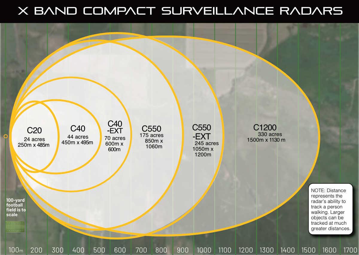 The range of the average military rifle is approximately 500 m, though some specialized rifles have even greater ranges. The C1200 radar in the C Series detects on-foot threats no later than 1500 m away and vehicle threats at 2000 m away.