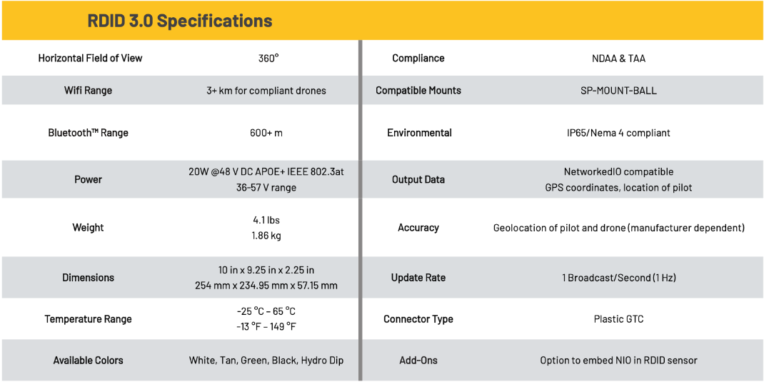 The Remote Drone ID (RDID) is an airspace security sensor from Spotter Global that offers ease of use, quick setup, and incredible value to stop unwanted drone threats with ZERO False Alarms.